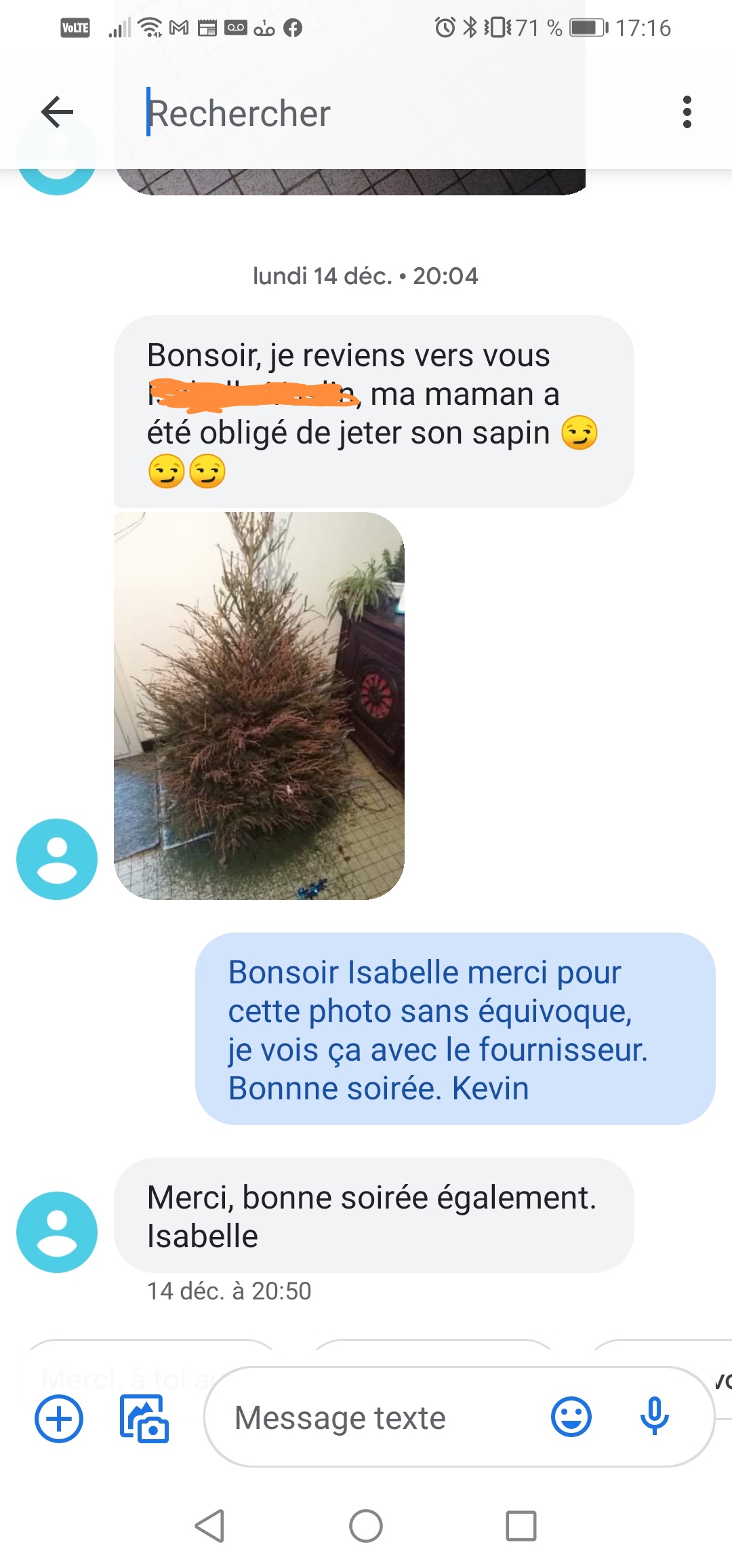 Nous avons travaillé avec cet établissement pour faire une vente de sapins dans une association de parents d'élèves. Catastrophe, plein de sapins ont eu des problèmes de perte d'épine anormales, 1 semaine après réception, soit vers le 10/15 décembre... J'ai perdu un temps fou pour recueillir les photos et témoignages des gens, à la demande de ce fournisseur qui nous avait assuré nous rembourser les sapins en réclamation. Nous n'avons jamais été remboursés....Merci Goin Sapin ! Je met une étoile car on ne peut pas en mettre 0. Mais c'est bien un zéro pointé que cela mérite.